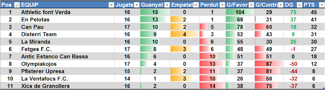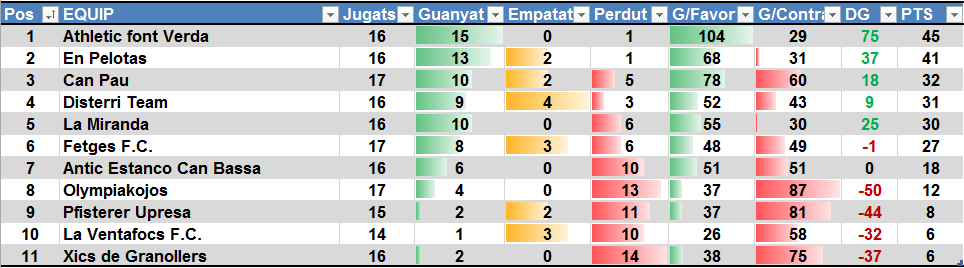 Després de la jornada 22 i a falta de un partit aplaçat entre La Ventafocs F.C. i Pfisterer Upresa, la classificació queda així.