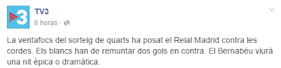 EXCLUSIVA Exclusives Dl 11 abr. 2016 TV3 es fa ressò de l’últim partit de La Ventafocs que va aconseguir posar el Real Madrid en problemes. Si voleu veure el partit de tornada aquest dijous a les 22:30 al 1r de Maig.